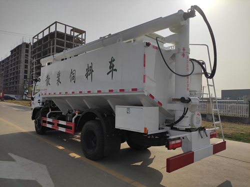 散裝飼料運(yùn)輸車,散裝飼料車的飼料罐架設(shè)在卡車的底盤上,罐頂開有進(jìn)料口.頂部的一根螺旋輸送卸料管(俗稱卸料絞龍)則可自由回轉(zhuǎn)和抬升,抬升的仰角可達(dá)60度。運(yùn)輸時,頂部的螺旋管平臥在罐頂;卸料時則抬起,使管端的出料口與畜禽飼養(yǎng)場貯料罐頂部的進(jìn)料門相接,駕駛室內(nèi)裝有操縱裝置(操縱裝置也可裝置在罐體尾部),卸料時通過車底的動力輸出軸和減速器來驅(qū)動螺旋,以完成卸料。