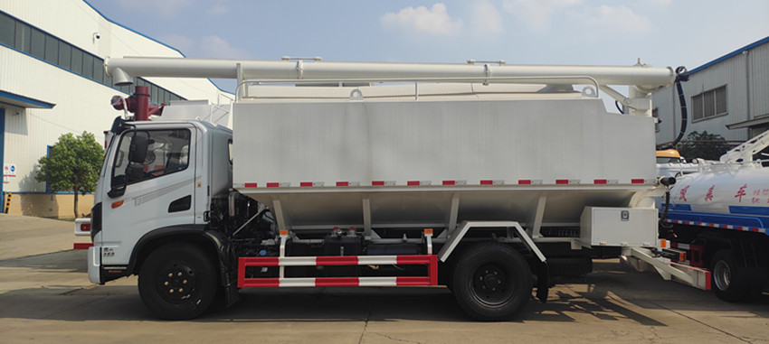 散裝飼料運(yùn)輸車,散裝飼料車的飼料罐架設(shè)在卡車的底盤上,罐頂開有進(jìn)料口.頂部的一根螺旋輸送卸料管(俗稱卸料絞龍)則可自由回轉(zhuǎn)和抬升,抬升的仰角可達(dá)60度。運(yùn)輸時(shí),頂部的螺旋管平臥在罐頂;卸料時(shí)則抬起,使管端的出料口與畜禽飼養(yǎng)場貯料罐頂部的進(jìn)料門相接,駕駛室內(nèi)裝有操縱裝置(操縱裝置也可裝置在罐體尾部),卸料時(shí)通過車底的動(dòng)力輸出軸和減速器來驅(qū)動(dòng)螺旋,以完成卸料。