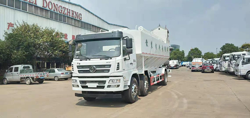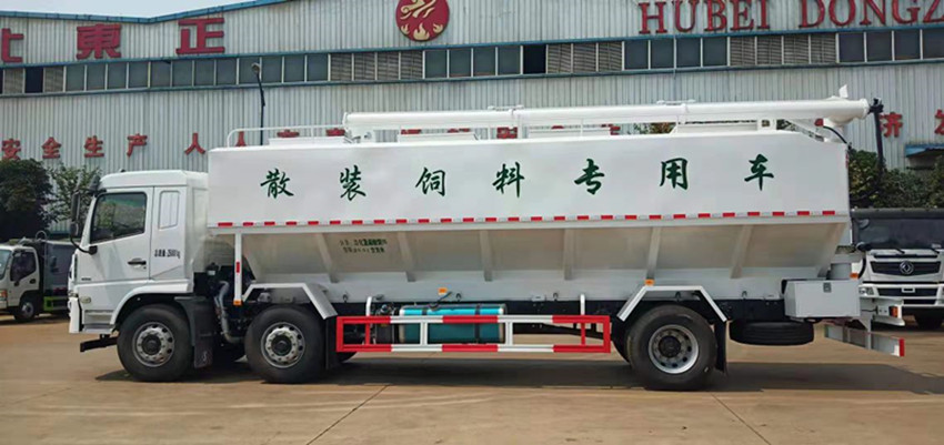散裝飼料運輸車,散裝飼料車的飼料罐架設(shè)在卡車的底盤上,罐頂開有進料口.頂部的一根螺旋輸送卸料管(俗稱卸料絞龍)則可自由回轉(zhuǎn)和抬升,抬升的仰角可達60度。運輸時,頂部的螺旋管平臥在罐頂;卸料時則抬起,使管端的出料口與畜禽飼養(yǎng)場貯料罐頂部的進料門相接,駕駛室內(nèi)裝有操縱裝置(操縱裝置也可裝置在罐體尾部),卸料時通過車底的動力輸出軸和減速器來驅(qū)動螺旋,以完成卸料。