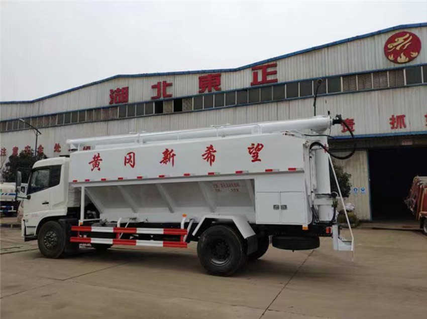 散裝飼料運輸車,散裝飼料車的飼料罐架設在卡車的底盤上,罐頂開有進料口.頂部的一根螺旋輸送卸料管(俗稱卸料絞龍)則可自由回轉(zhuǎn)和抬升,抬升的仰角可達60度。運輸時,頂部的螺旋管平臥在罐頂;卸料時則抬起,使管端的出料口與畜禽飼養(yǎng)場貯料罐頂部的進料門相接,駕駛室內(nèi)裝有操縱裝置(操縱裝置也可裝置在罐體尾部),卸料時通過車底的動力輸出軸和減速器來驅(qū)動螺旋,以完成卸料。