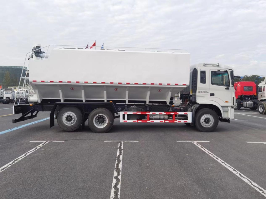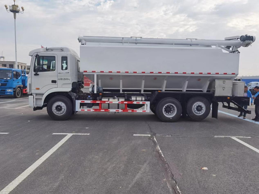 散裝飼料運(yùn)輸車,散裝飼料車的飼料罐架設(shè)在卡車的底盤上,罐頂開有進(jìn)料口.頂部的一根螺旋輸送卸料管(俗稱卸料絞龍)則可自由回轉(zhuǎn)和抬升,抬升的仰角可達(dá)60度。運(yùn)輸時(shí),頂部的螺旋管平臥在罐頂;卸料時(shí)則抬起,使管端的出料口與畜禽飼養(yǎng)場貯料罐頂部的進(jìn)料門相接,駕駛室內(nèi)裝有操縱裝置(操縱裝置也可裝置在罐體尾部),卸料時(shí)通過車底的動(dòng)力輸出軸和減速器來驅(qū)動(dòng)螺旋,以完成卸料。