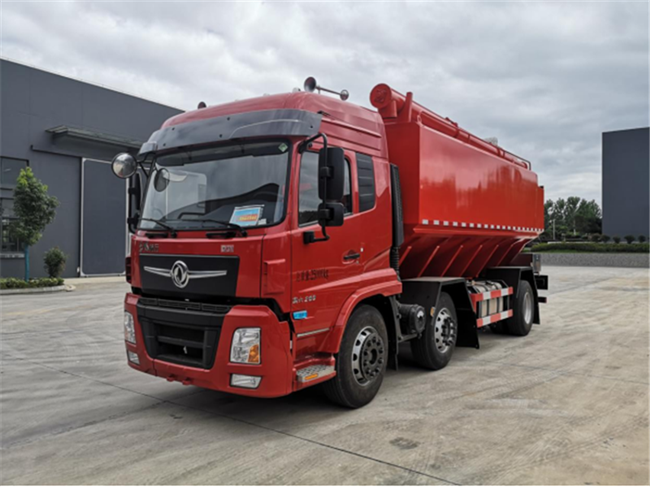 散裝飼料運輸車,散裝飼料車的飼料罐架設在卡車的底盤上,罐頂開有進料口.頂部的一根螺旋輸送卸料管(俗稱卸料絞龍)則可自由回轉和抬升,抬升的仰角可達60度。運輸時,頂部的螺旋管平臥在罐頂;卸料時則抬起,使管端的出料口與畜禽飼養(yǎng)場貯料罐頂部的進料門相接,駕駛室內(nèi)裝有操縱裝置(操縱裝置也可裝置在罐體尾部),卸料時通過車底的動力輸出軸和減速器來驅動螺旋,以完成卸料。