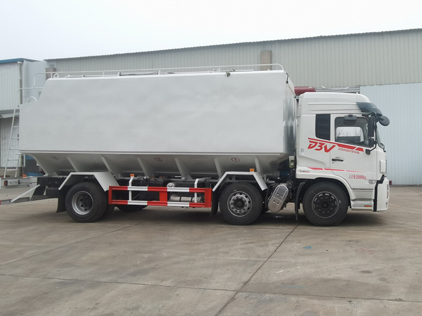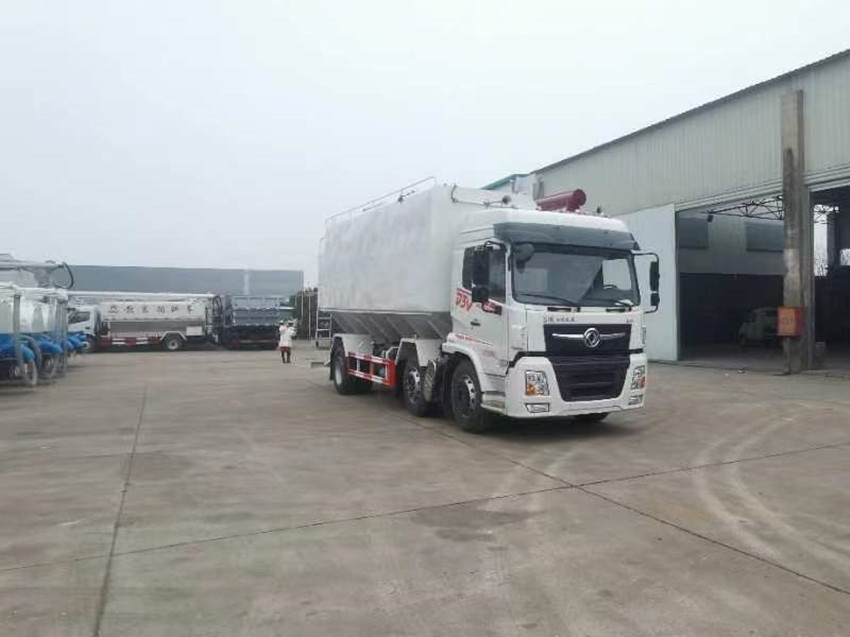 散裝飼料運(yùn)輸車,散裝飼料車的飼料罐架設(shè)在卡車的底盤上,罐頂開有進(jìn)料口.頂部的一根螺旋輸送卸料管(俗稱卸料絞龍)則可自由回轉(zhuǎn)和抬升,抬升的仰角可達(dá)60度。運(yùn)輸時(shí),頂部的螺旋管平臥在罐頂;卸料時(shí)則抬起,使管端的出料口與畜禽飼養(yǎng)場貯料罐頂部的進(jìn)料門相接,駕駛室內(nèi)裝有操縱裝置(操縱裝置也可裝置在罐體尾部),卸料時(shí)通過車底的動(dòng)力輸出軸和減速器來驅(qū)動(dòng)螺旋,以完成卸料。