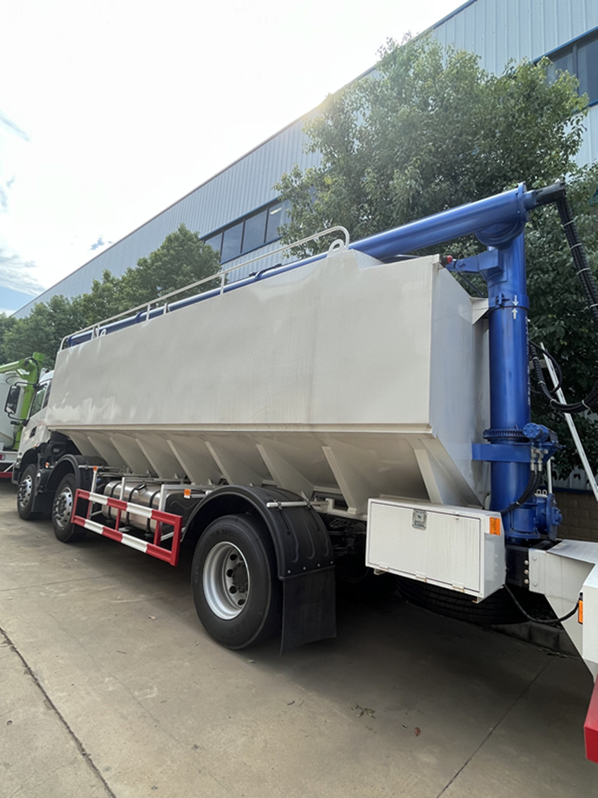 散裝飼料運(yùn)輸車,散裝飼料車的飼料罐架設(shè)在卡車的底盤上,罐頂開有進(jìn)料口.頂部的一根螺旋輸送卸料管(俗稱卸料絞龍)則可自由回轉(zhuǎn)和抬升,抬升的仰角可達(dá)60度。運(yùn)輸時,頂部的螺旋管平臥在罐頂;卸料時則抬起,使管端的出料口與畜禽飼養(yǎng)場貯料罐頂部的進(jìn)料門相接,駕駛室內(nèi)裝有操縱裝置(操縱裝置也可裝置在罐體尾部),卸料時通過車底的動力輸出軸和減速器來驅(qū)動螺旋,以完成卸料。