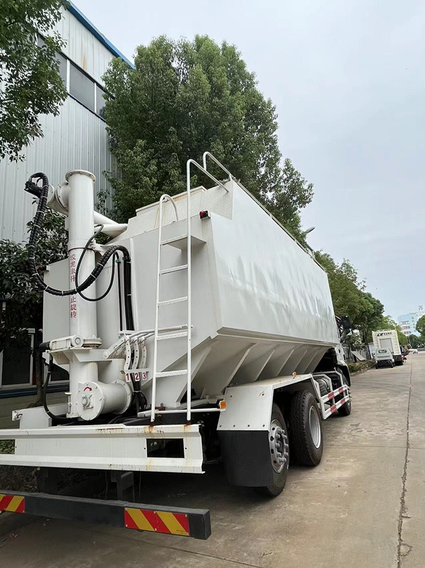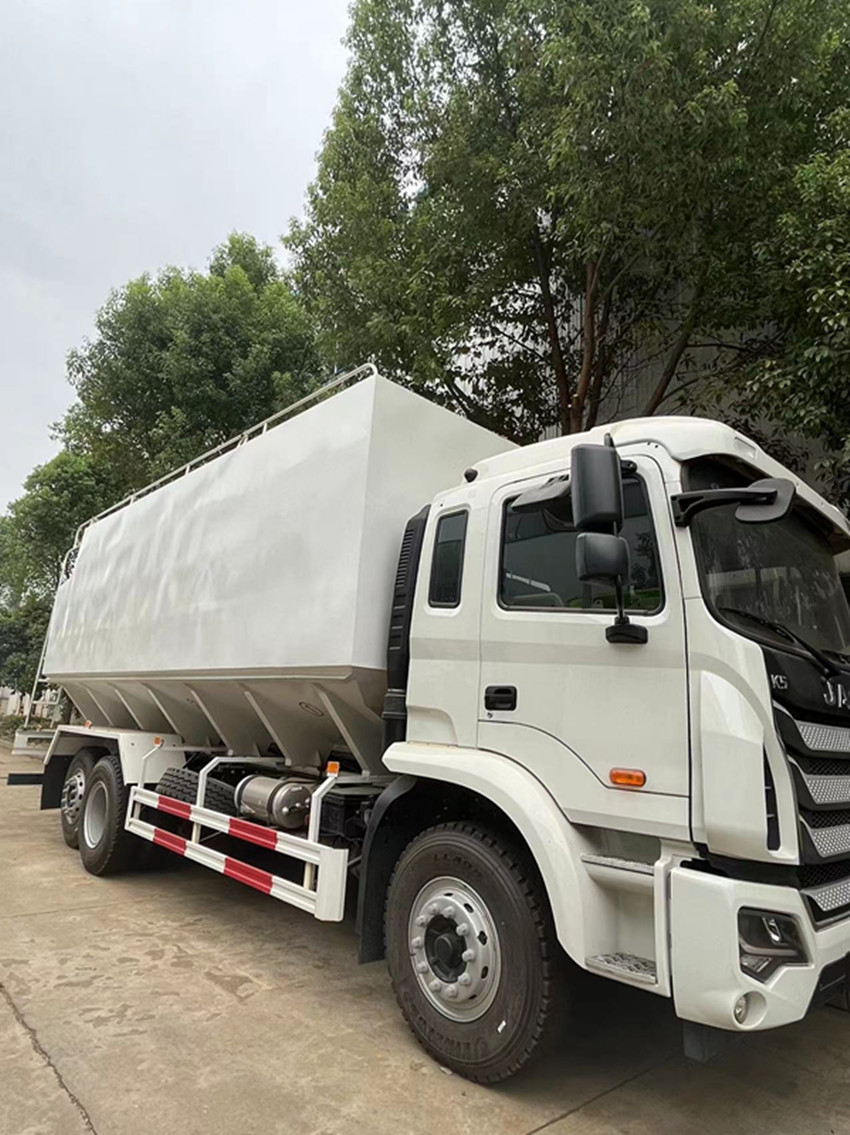 散裝飼料運(yùn)輸車,散裝飼料車的飼料罐架設(shè)在卡車的底盤上,罐頂開有進(jìn)料口.頂部的一根螺旋輸送卸料管(俗稱卸料絞龍)則可自由回轉(zhuǎn)和抬升,抬升的仰角可達(dá)60度。運(yùn)輸時(shí),頂部的螺旋管平臥在罐頂;卸料時(shí)則抬起,使管端的出料口與畜禽飼養(yǎng)場(chǎng)貯料罐頂部的進(jìn)料門相接,駕駛室內(nèi)裝有操縱裝置(操縱裝置也可裝置在罐體尾部),卸料時(shí)通過車底的動(dòng)力輸出軸和減速器來驅(qū)動(dòng)螺旋,以完成卸料。