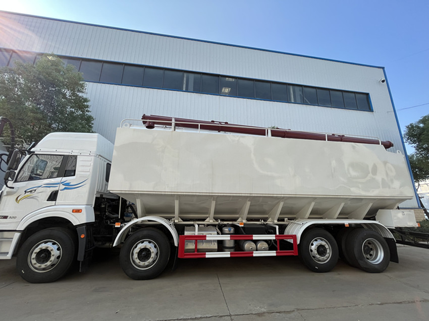 散裝飼料運輸車,散裝飼料車的飼料罐架設(shè)在卡車的底盤上,罐頂開有進料口.頂部的一根螺旋輸送卸料管(俗稱卸料絞龍)則可自由回轉(zhuǎn)和抬升,抬升的仰角可達60度。運輸時,頂部的螺旋管平臥在罐頂;卸料時則抬起,使管端的出料口與畜禽飼養(yǎng)場貯料罐頂部的進料門相接,駕駛室內(nèi)裝有操縱裝置(操縱裝置也可裝置在罐體尾部),卸料時通過車底的動力輸出軸和減速器來驅(qū)動螺旋,以完成卸料。