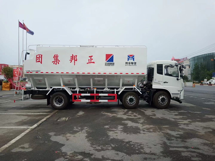 散裝飼料運輸車,散裝飼料車的飼料罐架設(shè)在卡車的底盤上,罐頂開有進料口.頂部的一根螺旋輸送卸料管(俗稱卸料絞龍)則可自由回轉(zhuǎn)和抬升,抬升的仰角可達60度。運輸時,頂部的螺旋管平臥在罐頂;卸料時則抬起,使管端的出料口與畜禽飼養(yǎng)場貯料罐頂部的進料門相接,駕駛室內(nèi)裝有操縱裝置(操縱裝置也可裝置在罐體尾部),卸料時通過車底的動力輸出軸和減速器來驅(qū)動螺旋,以完成卸料。