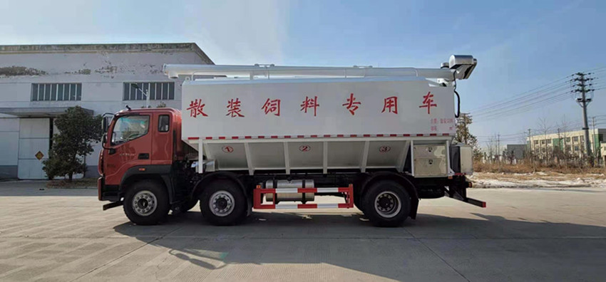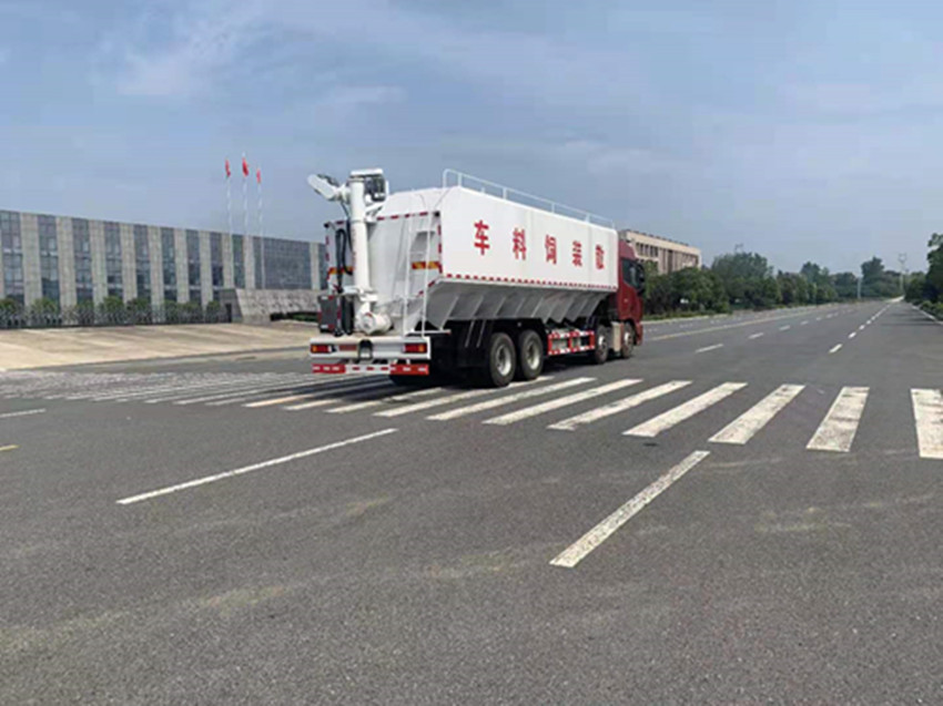 散裝飼料運輸車,散裝飼料車的飼料罐架設在卡車的底盤上,罐頂開有進料口.頂部的一根螺旋輸送卸料管(俗稱卸料絞龍)則可自由回轉和抬升,抬升的仰角可達60度。運輸時,頂部的螺旋管平臥在罐頂;卸料時則抬起,使管端的出料口與畜禽飼養(yǎng)場貯料罐頂部的進料門相接,駕駛室內(nèi)裝有操縱裝置(操縱裝置也可裝置在罐體尾部),卸料時通過車底的動力輸出軸和減速器來驅動螺旋,以完成卸料。
