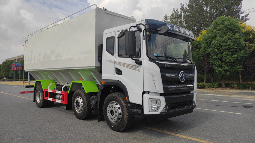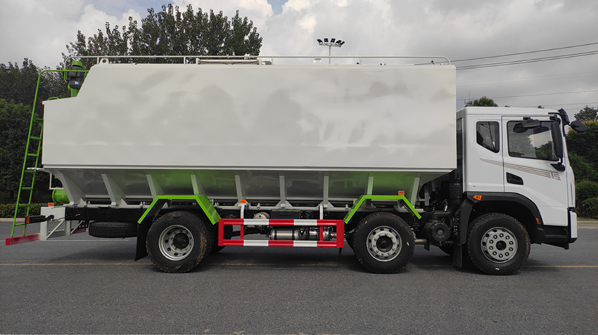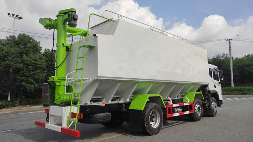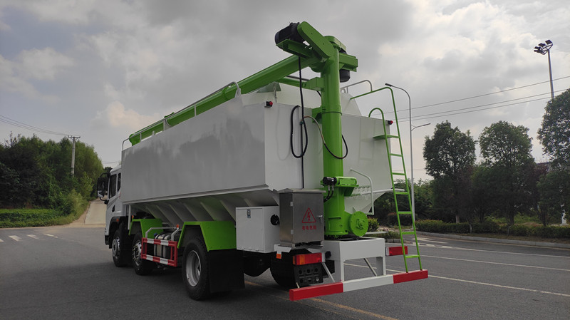 散裝飼料運輸車,散裝飼料車的飼料罐架設(shè)在卡車的底盤上,罐頂開有進(jìn)料口.頂部的一根螺旋輸送卸料管(俗稱卸料絞龍)則可自由回轉(zhuǎn)和抬升,抬升的仰角可達(dá)60度。運輸時,頂部的螺旋管平臥在罐頂;卸料時則抬起,使管端的出料口與畜禽飼養(yǎng)場貯料罐頂部的進(jìn)料門相接,駕駛室內(nèi)裝有操縱裝置(操縱裝置也可裝置在罐體尾部),卸料時通過車底的動力輸出軸和減速器來驅(qū)動螺旋,以完成卸料。