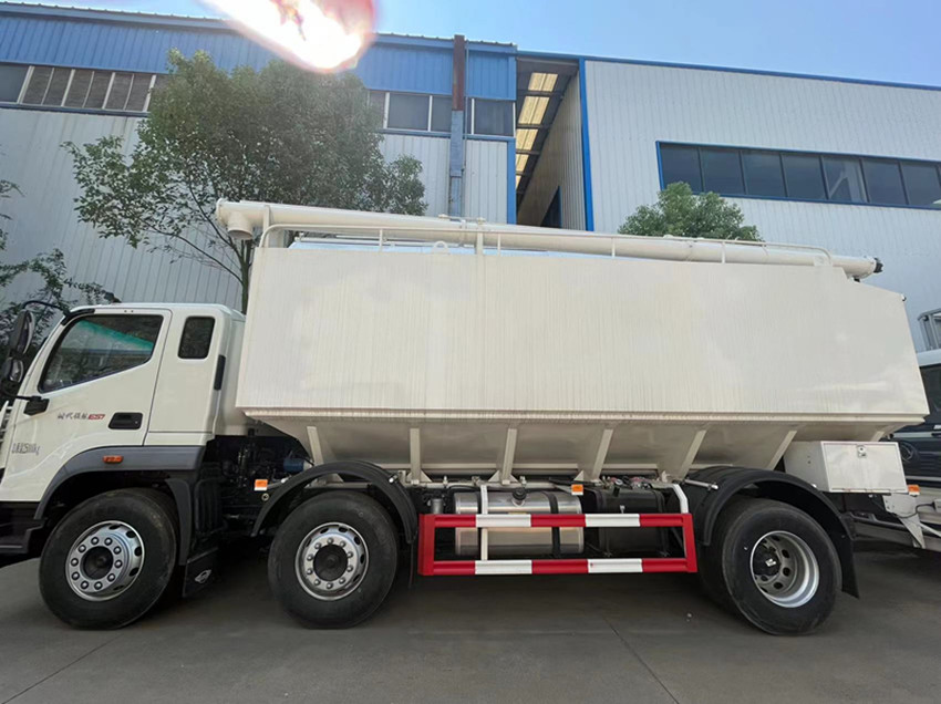 散裝飼料運(yùn)輸車,散裝飼料車的飼料罐架設(shè)在卡車的底盤上,罐頂開有進(jìn)料口.頂部的一根螺旋輸送卸料管(俗稱卸料絞龍)則可自由回轉(zhuǎn)和抬升,抬升的仰角可達(dá)60度。運(yùn)輸時(shí),頂部的螺旋管平臥在罐頂;卸料時(shí)則抬起,使管端的出料口與畜禽飼養(yǎng)場貯料罐頂部的進(jìn)料門相接,駕駛室內(nèi)裝有操縱裝置(操縱裝置也可裝置在罐體尾部),卸料時(shí)通過車底的動力輸出軸和減速器來驅(qū)動螺旋,以完成卸料。