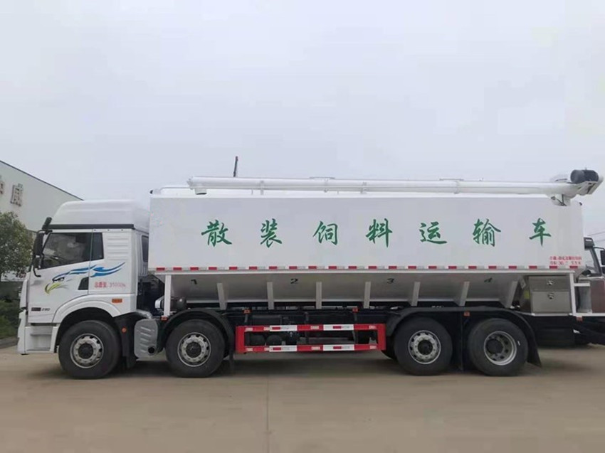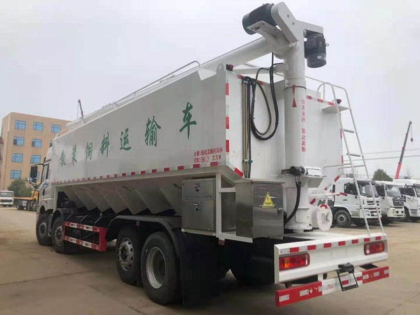 散裝飼料運輸車,散裝飼料車的飼料罐架設(shè)在卡車的底盤上,罐頂開有進料口.頂部的一根螺旋輸送卸料管(俗稱卸料絞龍)則可自由回轉(zhuǎn)和抬升,抬升的仰角可達60度。運輸時,頂部的螺旋管平臥在罐頂;卸料時則抬起,使管端的出料口與畜禽飼養(yǎng)場貯料罐頂部的進料門相接,駕駛室內(nèi)裝有操縱裝置(操縱裝置也可裝置在罐體尾部),卸料時通過車底的動力輸出軸和減速器來驅(qū)動螺旋,以完成卸料。