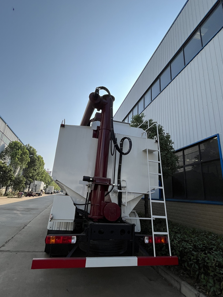 散裝飼料運輸車,散裝飼料車的飼料罐架設在卡車的底盤上,罐頂開有進料口.頂部的一根螺旋輸送卸料管(俗稱卸料絞龍)則可自由回轉(zhuǎn)和抬升,抬升的仰角可達60度。運輸時,頂部的螺旋管平臥在罐頂;卸料時則抬起,使管端的出料口與畜禽飼養(yǎng)場貯料罐頂部的進料門相接,駕駛室內(nèi)裝有操縱裝置(操縱裝置也可裝置在罐體尾部),卸料時通過車底的動力輸出軸和減速器來驅(qū)動螺旋,以完成卸料。