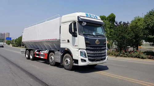 散裝飼料運(yùn)輸車,散裝飼料車的飼料罐架設(shè)在卡車的底盤上,罐頂開有進(jìn)料口.頂部的一根螺旋輸送卸料管(俗稱卸料絞龍)則可自由回轉(zhuǎn)和抬升,抬升的仰角可達(dá)60度。運(yùn)輸時(shí),頂部的螺旋管平臥在罐頂;卸料時(shí)則抬起,使管端的出料口與畜禽飼養(yǎng)場(chǎng)貯料罐頂部的進(jìn)料門相接,駕駛室內(nèi)裝有操縱裝置(操縱裝置也可裝置在罐體尾部),卸料時(shí)通過車底的動(dòng)力輸出軸和減速器來驅(qū)動(dòng)螺旋,以完成卸料。