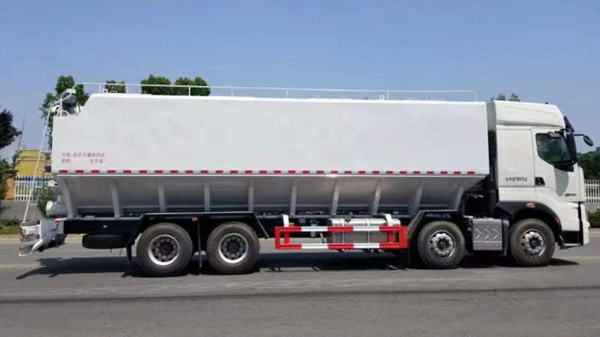 散裝飼料運輸車,散裝飼料車的飼料罐架設在卡車的底盤上,罐頂開有進料口.頂部的一根螺旋輸送卸料管(俗稱卸料絞龍)則可自由回轉(zhuǎn)和抬升,抬升的仰角可達60度。運輸時,頂部的螺旋管平臥在罐頂;卸料時則抬起,使管端的出料口與畜禽飼養(yǎng)場貯料罐頂部的進料門相接,駕駛室內(nèi)裝有操縱裝置(操縱裝置也可裝置在罐體尾部),卸料時通過車底的動力輸出軸和減速器來驅(qū)動螺旋,以完成卸料。