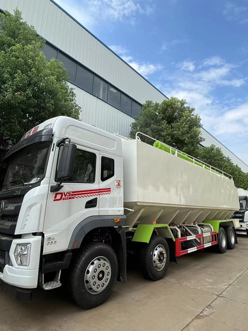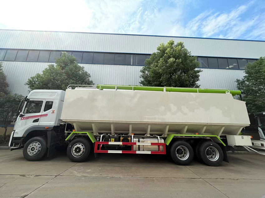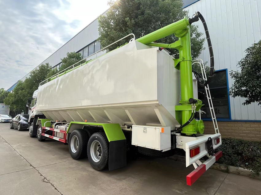 散裝飼料運(yùn)輸車,散裝飼料車的飼料罐架設(shè)在卡車的底盤上,罐頂開有進(jìn)料口.頂部的一根螺旋輸送卸料管(俗稱卸料絞龍)則可自由回轉(zhuǎn)和抬升,抬升的仰角可達(dá)60度。運(yùn)輸時(shí),頂部的螺旋管平臥在罐頂;卸料時(shí)則抬起,使管端的出料口與畜禽飼養(yǎng)場(chǎng)貯料罐頂部的進(jìn)料門相接,駕駛室內(nèi)裝有操縱裝置(操縱裝置也可裝置在罐體尾部),卸料時(shí)通過車底的動(dòng)力輸出軸和減速器來驅(qū)動(dòng)螺旋,以完成卸料。